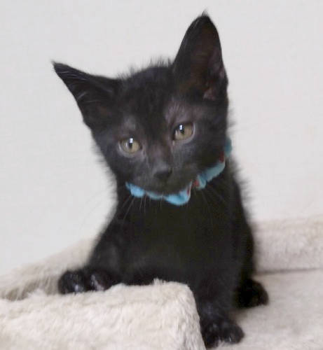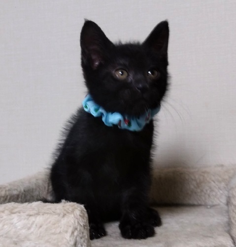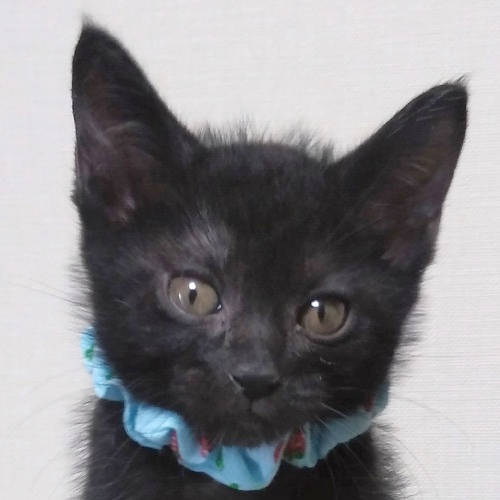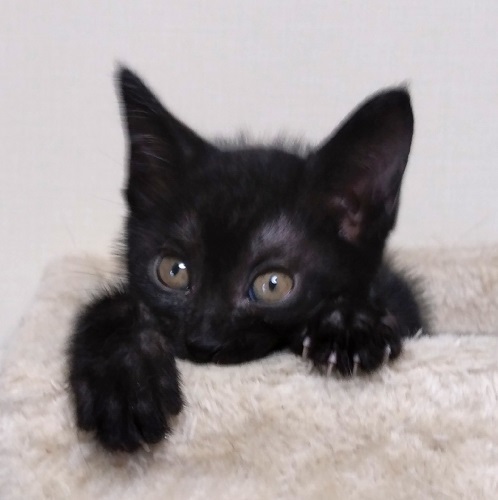 | 特徴(性格など) | 黒猫で現在は白いポイントも見当たりません。 尻尾は長く、ほぼまっすぐですが一番先っぽがくるりとしています。 (毛の中なのでわかりにくいです) 人間がミルクで育てたため、人なれは完璧です。 きょうだいのなかで、いちばん元気いっぱい。 きょうだい一緒のお迎えは大歓迎です。 |