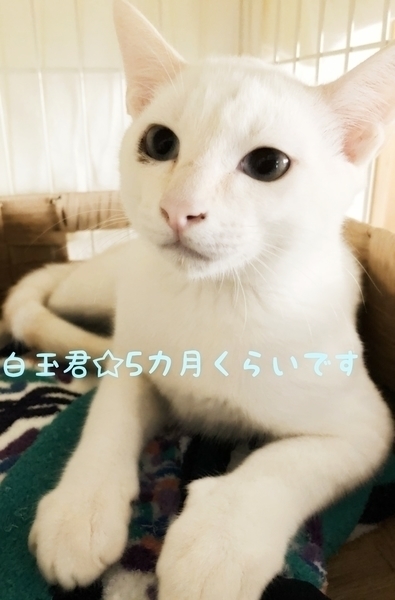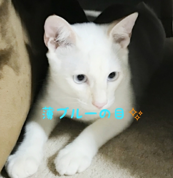 | 特徴(性格など) | 代理投稿の為 簡単ではございますが 全体的に白 尻尾に薄茶色の縞模様があり 真っ直ぐな長ーいシッポにスラーッと長い手足 パステルブルーの目が印象的な スタイル抜群!!イケメン白猫です☆ 大きな体にクールな眼差し 見た目とは違って 預かり宅の猫とは距離をおく小心者 好奇心旺盛でまだまだ子猫の可愛らしさがいっぱいで 見た目とのギャップに笑わせられてます。 日中は 静かに留守番しております。 |