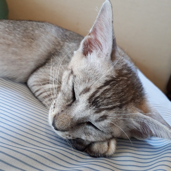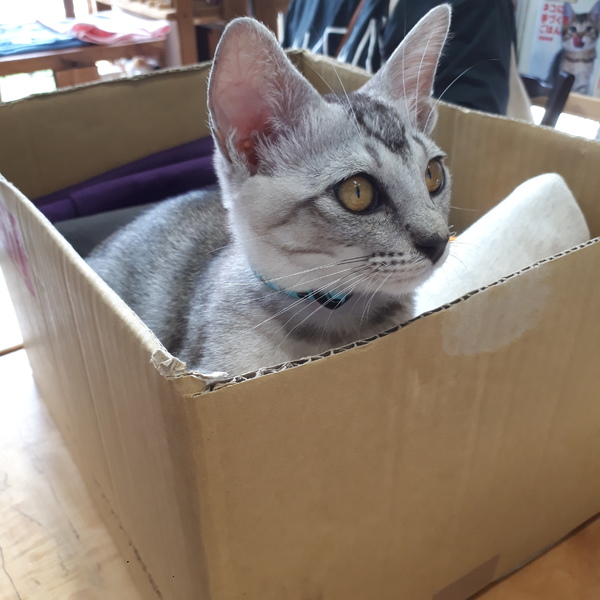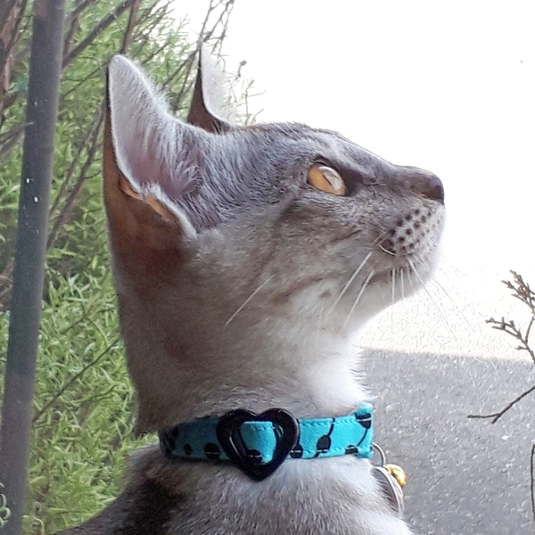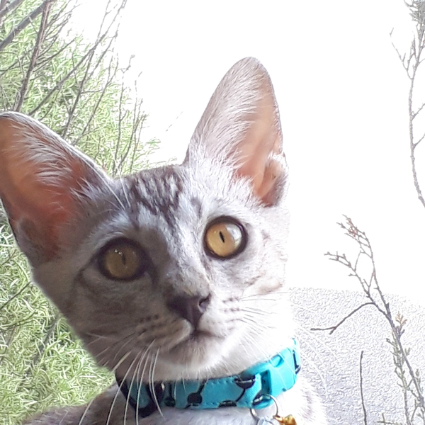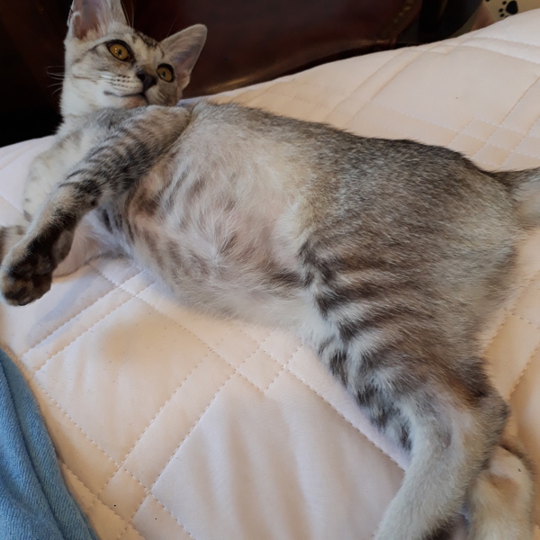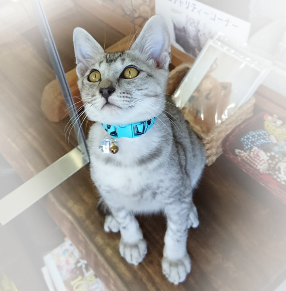 | 特徴(性格など) | 涼し気なシルバーグレーの体、お腹は白にグレーの点々、手足と鍵尻尾の先とオデコが縞々です。 活発で甘えん坊。違うページで掲載のマリモちゃん(メス)と仲良く育っています。人も大好きで慣れ慣れ、ぺったりくっついて来るカマチョボーイです♪ |