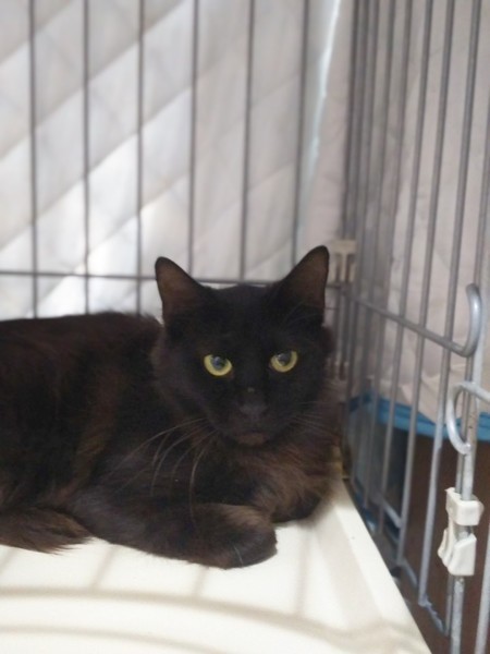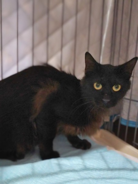 | 特徴(性格など) | 少し長毛の黒猫です。 茶色ぽい色も少し混じってます。 クリクリの、目がとても可愛いです。 大人しく手を出すことは無いですが、まだ人馴れしていないのでケージの隅っこで怖がっています。 近づくと小さな声でシャーシャー言ってます。 預かりボランティアさんのお宅で人馴れしてくれるようにお世話を、お願いしています。 ご飯はしっかり食べて、元気に過ごしてます。 この様な猫ちゃんでも時間は必要ですが、だんだん触れるようになってきます。 少しでも気になられた方ご連絡お待ちしています。 預かりさんの娘さんには心を開いてくれているそうです。 |