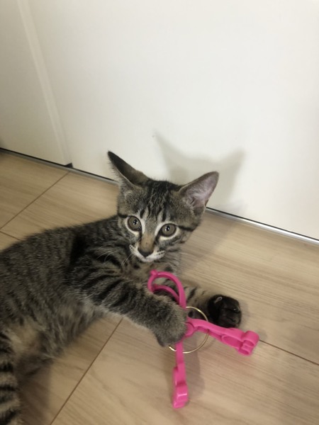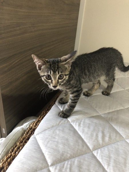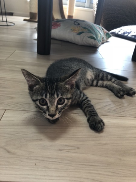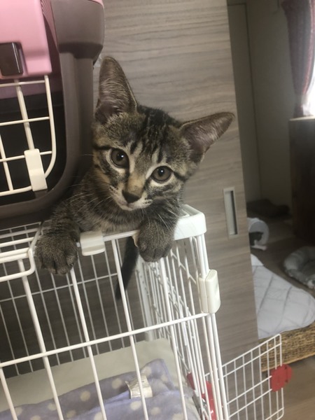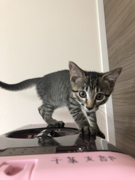 | 特徴(性格など) | 2020.5.10生まれ(推定) 毛色:キジトラ 黒キジトラのぱっちりお目目がかわいい女の子。 ご飯より遊びが大好きな子です。 時折小首を傾げてこちらを見ているなんとも可愛らしいカイラ。 ゆっくりスピードモードならお掃除ロボットとも遊べます( ̄▽ ̄) おしとやか系女子ですが、ニャンプロは男子にも挑む元気女子! 兄妹と一緒のお家だと嬉しいです(^^) |