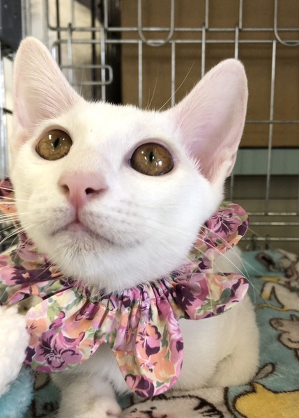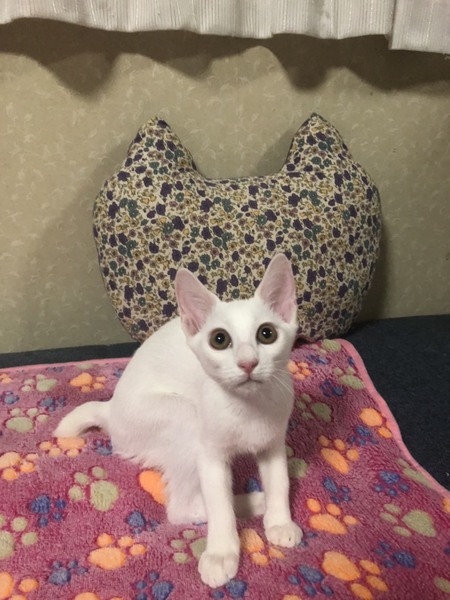 | 特徴(性格など) | 2020.6.5生まれ(推定) 毛色:白 兄妹の中でも1番小柄な白猫の女の子。 運動神経がバツグンに良く、兄妹達を毎日ハァーハァー言わせています(笑) 人の足元をチョンとして走り去るのは、追いかけっこのお誘いのようだけど、 怪我するといけないので(人間が)お断りしています。 疲れ知らずの元気っ子パピコと、たくさん遊んであげてください。 兄妹一緒のお迎えも可能です。ご相談くださいませ。 |