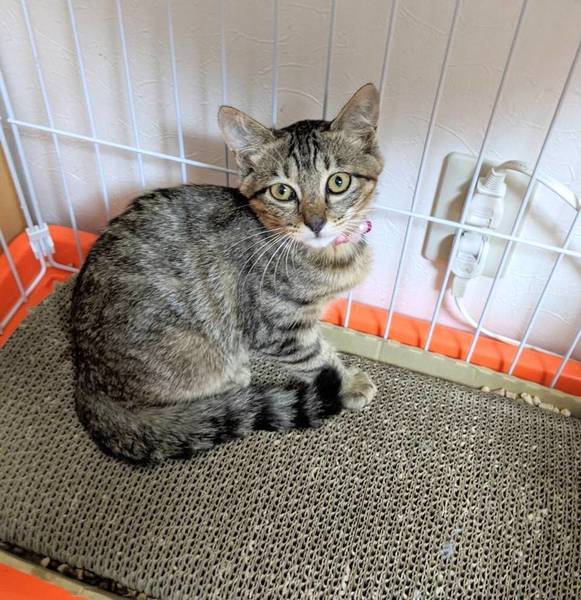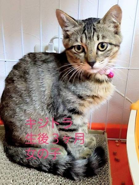 | 特徴(性格など) | キジトラの姉妹です。 耳ダニ駆除・駆虫済み・ワクチン1回接種済み。 エイズ・白血病共に陰性でした。 まだ緊張気味ですが、威嚇などはしません。 人慣らしの修行中です! |