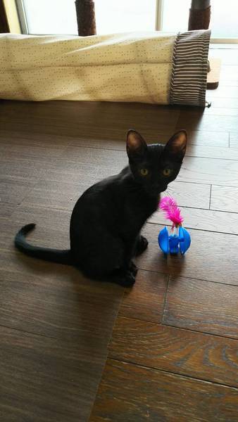 | 特徴(性格など) | 一匹は少し控えめな性格ですがナデナデが大好きな子でゴロゴロします。 もう一匹はとっても甘えん坊さんで遊ぶのが大好きな子です。 2匹とも黒毛の短毛で真っすぐで綺麗な長い尻尾をしています。 よく食べすくすくと元気に育っております。 |