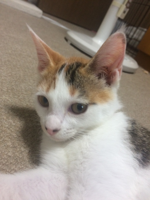 | 特徴(性格など) | 三毛猫ですが、鼻の部分に黒い点々があるのがご愛嬌です^_^ しっぽは長くてまっすぐです。抱っこが大好きでゴロゴロと甘えるとても愛らしい女の子です。 |