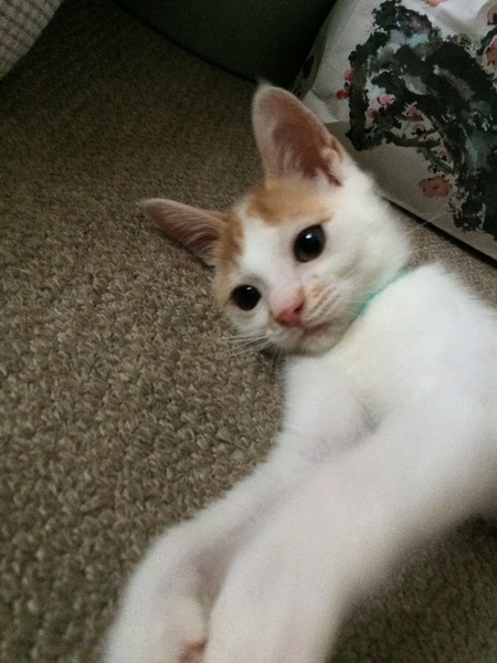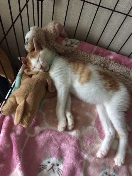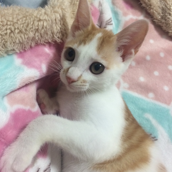 | 特徴(性格など) | 白に茶のトラ柄が入ってます。 しっぽも茶トラ柄で長くてまっすぐです。 この子はとても人なつこくて、猫もヒトも大好きな物怖じしない性格です。寝る時に身体にぴったりくっついてきます。それがとても可愛くて甘え上手な男の子です^_^ 6匹兄妹のうちの1匹です |
