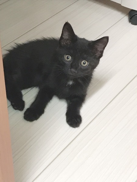 | 特徴(性格など) | 女の子です。 とても活発で元気です。 気性は荒く無く甘えん坊です。 遊び好きです。 黒猫ですが、胸とお腹が白いのがキュートです。 毛足が少しだけ長めでフワフワです。 よく見ると黒の中に縞模様があります。 尻尾はまっすぐで綺麗です。 ミルクの時から面倒を見ているため、情もわいており親バカですがメチャメチャ可愛いです。 保護した翌日、病院で健康診断を受けました。 結果は少し体は小さいですが、生後3週間の女の子で健康状態は良好とのことでした。 ワクチンと避妊手術はまだ早いのでレボリューションと便の検査をしました。 便の検査は良好でした。 |
