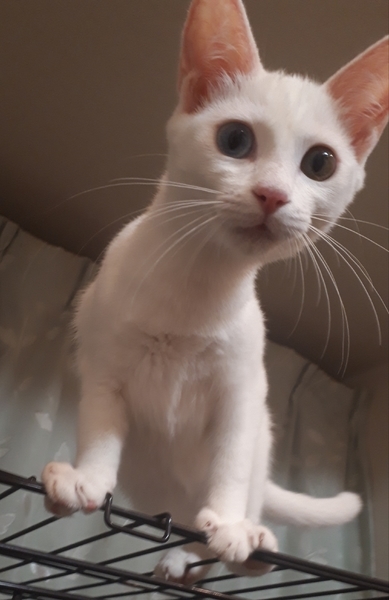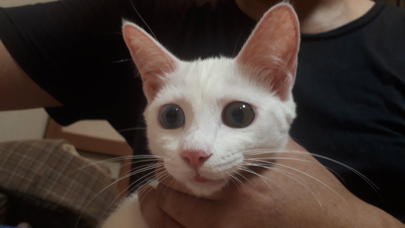 | 特徴(性格など) | オッドアイの白猫で女の子です。 おっとりした性格で人見知りも猫見知りもしない子です。 猫じゃらしやレーザーポインターで遊ぶのが大好きです。 |