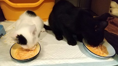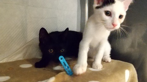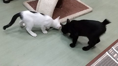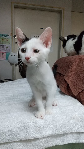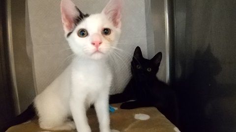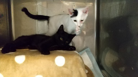 | 特徴(性格など) | 【黒猫】3ヶ月半位の男の子で、兄弟と離れてしまったので寂しがってちょっと ビクビクでしたが、抱っこすることはできますし、よく遊びとても元気です。 シャンプー・ノミダニ処置・虫下し処置済。 ワクチンは2回してあります。 【白黒猫】生後2ヶ月半位の男の子です。 この子は保護当時片目が少し悪く治療して、今は殆ど良くなりました。 眼自体は見えていますのでとても元気です。 とにかく人懐こくて可愛い子猫です。 他のねこちゃんともすぐに仲良くなります。 シャンプー・ノミダニ処置・虫下し処置済。 ワクチンは1回してあります。 |