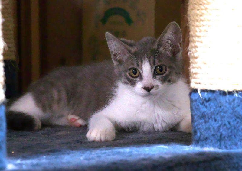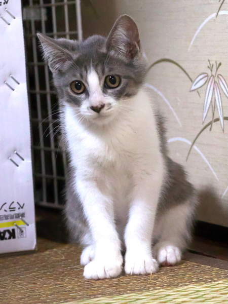 | 特徴(性格など) | グレー・白 保護時、体の左側3か所(顎かさぶた、お腹ハゲ、前足の小指なく化膿)の為、様子を見ていましたが、完治しました。 抱っこすると静かにしていますが、自分からは人によって来ません。 慎重で、だんだん慣れてきました。 |