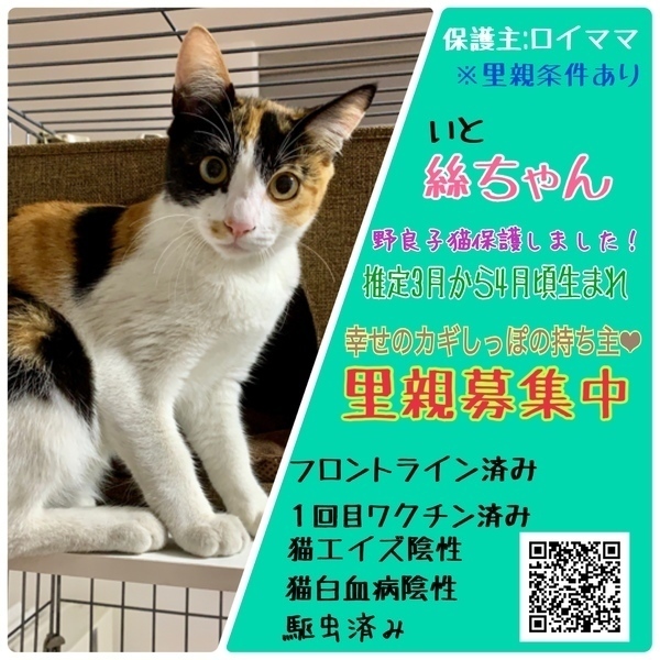 | 里親募集する理由 | 自宅周辺をウロウロしていた野良子猫でした。 大通りがあり、車通りもかなり多く、少し前に成猫が轢かれて亡くなっていました。 この子たちが同じ目に遭わず、安全な幸せを手にして欲しいと思い保護しました。 保護主宅では犬1猫1おり、経済的にこれ以上は増やせません。 幸せバトンを繋ぐまで、責任を持ってお世話させていただきます。 |