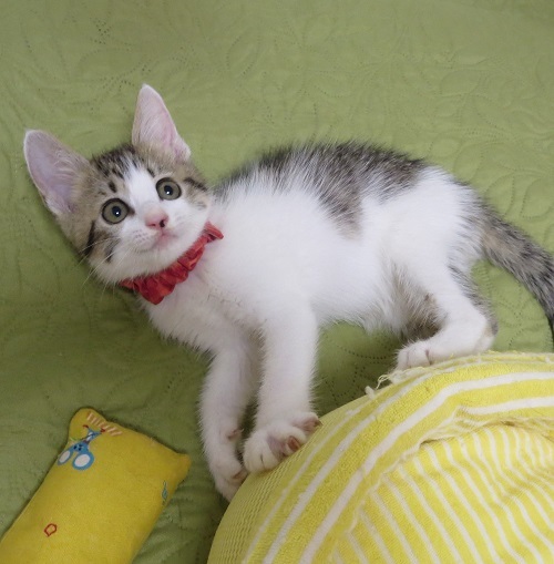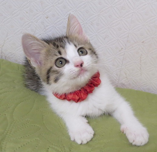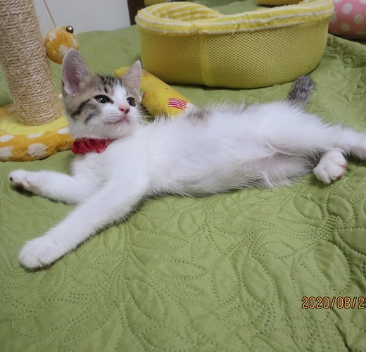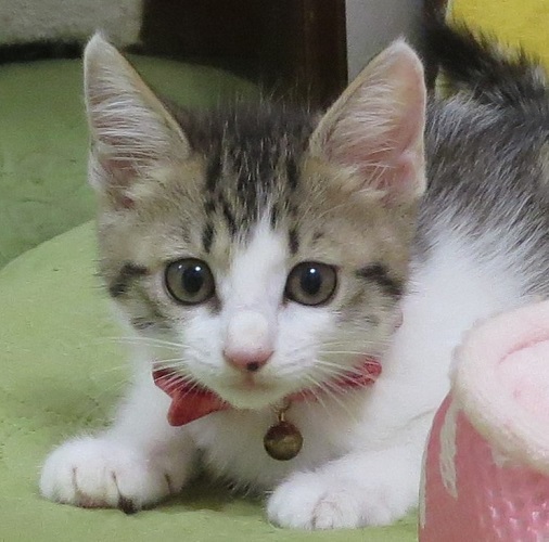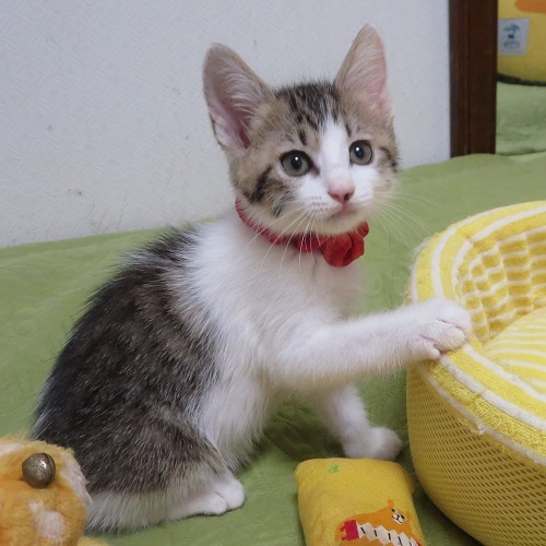 | 特徴(性格など) | 顔も姿もとても整ったキジ白のチビさんです。尻尾も太くて長くて立派。毛はフワッとしています。 もも太くん、さくらちゃんとの3兄妹。元気で明るくて無邪気で、子猫の見本のような、夫々に大変に可愛い兄妹です |
