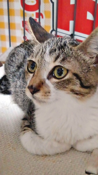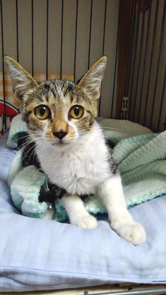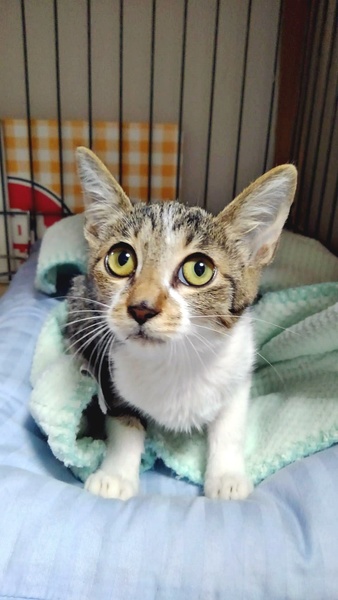 | 特徴(性格など) | 【仮名】ムギ 【性格】 キジ白 薄茶入り 初めから抱っこできる穏やかな性格。 あごを撫でると首を伸ばしスリスリしてきます。 おもちゃには興味津々です。 猫見知りもなく仲良くできます。 まだ子猫なので、なるべくお留守番の時間が少ないご家庭が希望です。 ほかの子猫など2匹一緒に家族にしていただけたら…と思っています。 |