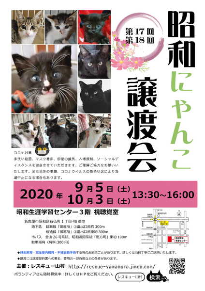 | その他(譲渡条件など) | 猫の飼育が初めての方も大歓迎です♪ トライアルで必要な用品のアドバイスから飼育サポートまでしっかり対応させて頂きます。 お見合い(譲渡会) →後日、ご自宅にお届けしてトライアル →正式譲渡 となります。 ●愛知県にお住まいでペット飼育可能住宅 ●完全室内飼い ●必要な予防処置、医療処置、不妊去勢を行うこと ●お問い合わせの際にアンケートをお願いいたします ●住居が変更になる場合(離婚含む)も終生愛育を約束くださる方 ●トライアルのお届けにご自宅へお伺いすることを了承していただける方 ●ご家族皆さんが里親になることを賛成なこと ●譲渡後の様子を定期的に教えてくださる方 ●譲渡が決まった時 契約書にサインと捺印をしてくださる方 ●高齢者(65歳以上)、単身者、同棲中のカップルの方はお断りする場合があります。 ●健康によい餌をかんがえてくださる方 いろいろお聞きすることになりますが、命のやり取りのためご理解をお願いいたします。 ◆仔猫ご希望の里親様◆ 仔猫は下痢等により数時間対応ができなかっただけでも死に至る事があります。 よって子猫はお留守番のない又は少ないご家庭への譲渡に限らせて頂いております。 ◆譲渡会のお知らせ◆ 2ヶ月に1~2回の頻度で譲渡会を開催しています。 レスキュー山村では譲渡会でのお見合いがメインとなります。 ペットではなく、共に暮す家族の一員としてお迎えくださるお家を希望しておりますので お世話してくださるご家族の皆さん、またはご夫婦ご一緒に会いにいらしてください。 詳しくは、レスキュー山村のホームページをご覧ください。 https://rescue-yamamura.jimdo.com/ |