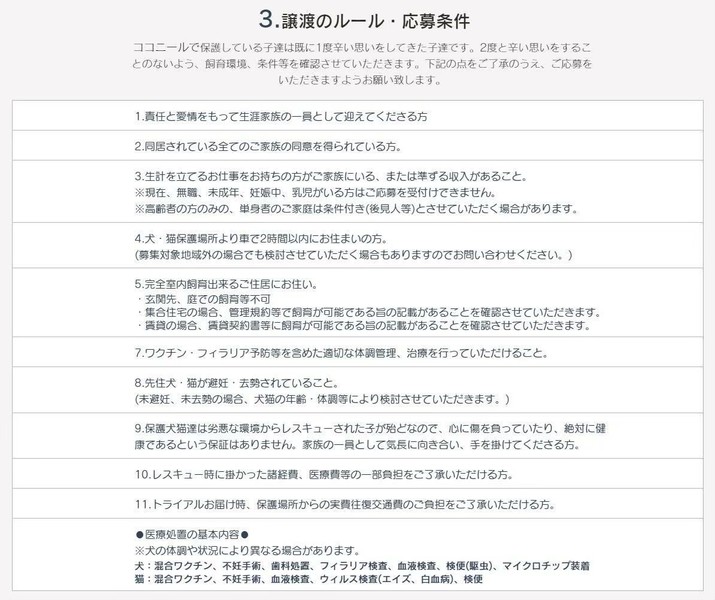 | その他(譲渡条件など) | 神奈川県、東京都内で、預け入れ宅より1時間以内 ✱応募方法✱ 里親希望の方は、以下のURL又は画像に記載の『譲渡のまでの流れ』『譲渡のルール・応募条件』『譲渡に関してのお願い』のご確認のうえ、『里親希望エントリーフォーム』よりご応募お願い致します。 ※お返事には1週間程度のお時間が掛かる場合があります。 『譲渡のまで流れ』 https://coconeel.wixsite.com/website/bosyunonagare 『譲渡に関してのお願い』 https://coconeel.wixsite.com/website/blank-4 『譲渡のルール・応募条件』 https://coconeel.wixsite.com/website/blank 『里親希望エントリーフフォーム』 https://coconeel.wixsite.com/website/entry ※ご質問等ある場合は、フォームの最後の欄にお書き添えください。 ※先着順ではありません。 犬の性格・年齢・病気等を考慮し、多方面から検討させていただきます。 |