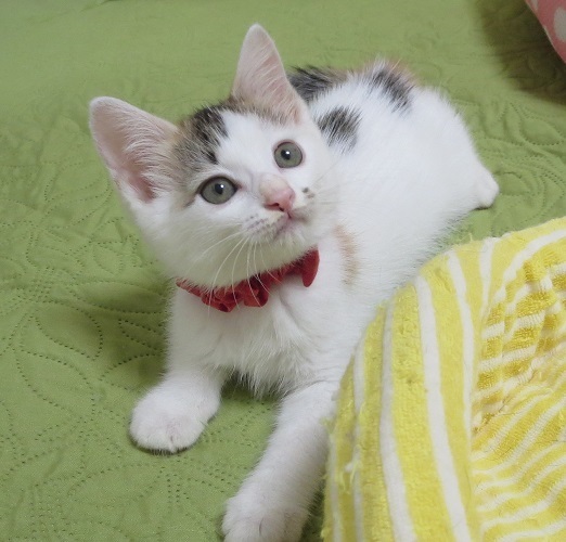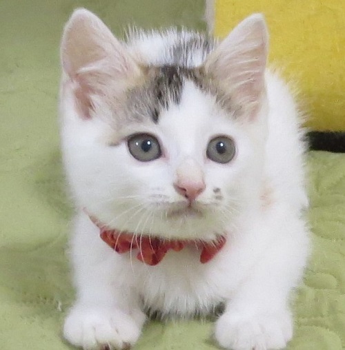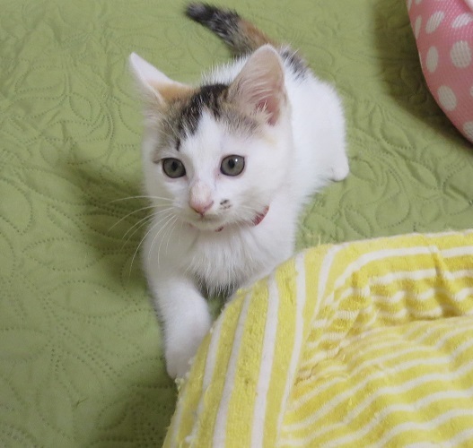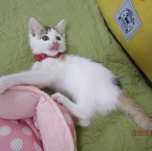 | 特徴(性格など) | 白三毛の毛色がとても優しく綺麗です。毛はフワッとしています。 今はずんぐり体型で、それがまた可愛さ倍増。元気で甘えん坊、将来の姿が楽しみな綺麗なチビ三毛ちゃんです。 |