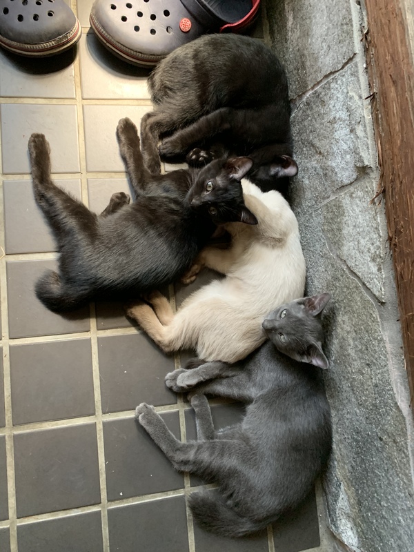 | 特徴(性格など) | 4兄妹ともしっぽが短いかぎしっぽです! シャム猫ミックスのミルクちゃんはおてんば娘!最近は少し落ち着きだしましたが兄妹一の好奇心旺盛な子です! 真っ黒な二匹の見分け方は、耳にエンジェルマークのついたあずきちゃん!もう一匹は甘えんぼなまめくん! あずきちゃんはマイペースで1人で遊ぶ事の方がおおいです!まめくんはいつも誰かと一緒!性格は真反対だけど顔はそっくりの2匹です! ロシアンブルーの様な子はトトロくん! 兄妹一の食いしん坊!いつもお姉ちゃんたちの残り物を狙ってるぽっこりお腹のトトロです! |