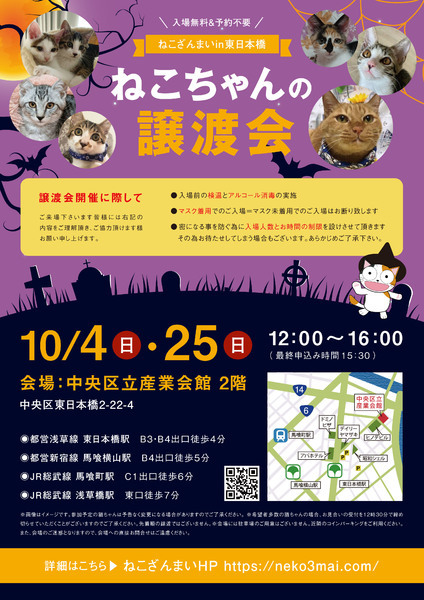 | その他(譲渡条件など) | 【新型コロナウィルス感染予防対策について】 譲渡会開催に際し、ご来場下さいます皆様には以下の内容をご理解頂き、ご協力頂けます様お願い申し上げます。 ●入場前の検温とアルコール消毒の実施 ●マスク着用でのご入場=マスク未着用でのご入場はお断り致します ●入場人数の制限=一度に入場できるのは50名迄とさせていただきます ●時間と人数の制限=密になる事を防ぐ為に入場人数とお時間の制限を設けさせて頂きます その為お待たせしてしまう場合もございます ●会場利用規約により、ご来場者様の連絡先を控えさせていただきます あらかじめご了承下さい 里親様決定は14時以降となります。 その後、迎え入れ準備の説明等のお時間も頂戴しますので、お時間に余裕を持ってご来場下さい。 諸々の制限がございますが、安心・安全な譲渡会運営のためにご理解・ご協力いただきますようお願い申し上げます。 ~~~~~~~~~~~~~~~~~~~~~~~~~~~~~~ ★仔猫ご希望の里親様★ 仔猫ちゃんたちは、まだ体がしっかりしていない赤ちゃんです。 下痢だけでも数時間対応ができなかっただけ死に至る事もあります。 その為、月齢に応じたお留守番時間を設けさせていただいております。 また、子猫ちゃん(6ヶ月未満)の里親様には子猫支援金のご協力をお願い致しております。 ★猫ちゃんとのお見合いは譲渡会で!★ ねこざんまいの猫ちゃんは譲渡会でのお見合いのみとなります。 『この子はいつ譲渡会に参加するの?』『譲渡会場の場所はどこ?』など はねこざんまいホームページをご覧ください。 https://neko3mai.com/ ★楽しく猫ちゃんと触れ合って★ ねこざんまい譲渡会は、猫ちゃんも里親様も保護主も笑顔で過ごせる譲渡会を目指しています。 これから20年以上、楽しい時も、悲しい時もいつも傍にいてくれる大切な家族になる猫ちゃんです。 会場には沢山の猫ちゃんがいます。 1匹1匹、触れ合って猫ちゃんとお話ししてください。 『初めて猫ちゃんを家族に迎える方』 『先住猫ちゃんのお友達を迎える方』など トライアルの仕方や先住猫ちゃんと仲良くなるコツなど経験豊富な保護主やスタッフにお気軽にご相談ください! 猫を愛し、そして猫に愛されている猫好きスタッフと保護主がアドバイスさせていただきます。 ★里親希望のみなさまへ★ ペットではなく、家族一員としてたっぷり愛情を注いでくださるご家庭をお待ちしております。 恐れ入りますが、 ・学生の方 ・一人暮らし、同棲中の方 ・子猫、若猫希望の60歳以上のみのご家庭 ・脱走防止対策にご協力いただけない方 は原則譲渡を遠慮させていただいております。 ただし、預かりボランティアさんとして新しい家族が決まるまでの間、猫ちゃんを預かっていただく道もございます。 参加猫ちゃんは、それぞれ保護主(実際に猫ちゃんを自宅に入れ、保護をしている方)が異なります。 詳しい条件なども異なる場合がございますので、会場内で直接保護主とお話ください。 〖共通条件〗 1.終生飼育 2.完全室内飼い 3.脱走防止対策へのご協力 4.避妊去勢手術 5.契約書類へのサイン 6.定期報告 7.医療費等の負担 当日の猫ちゃんを連れて帰ることはできません。後日、保護主が里親様のご自宅までお届け致します。 その為、移動の際の猫ちゃんの負担を月齢などから考慮し、お届け地区を限定させて頂くこともございますのでご了承ください。 ご理解とご協力のほど宜しくお願い致します。 ☆よくある質問☆ ・譲渡の条件 ・ご負担頂く費用 ・譲渡会の場所等は ホームページに詳しく掲載させて頂いておりますのでご覧ください。 https://neko3mai.com/ メールでのお問い合わせはすぐにご返答出来ない場合がございますのでご了承ください。 ホームページ https://neko3mai.com/ お問い合わせ http://www.neko3mai.com/contact/form_general.html ねこざんまいブログ http://ameblo.jp/neko3mai/ |