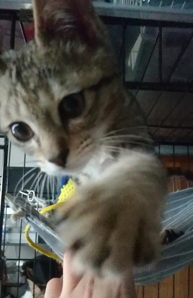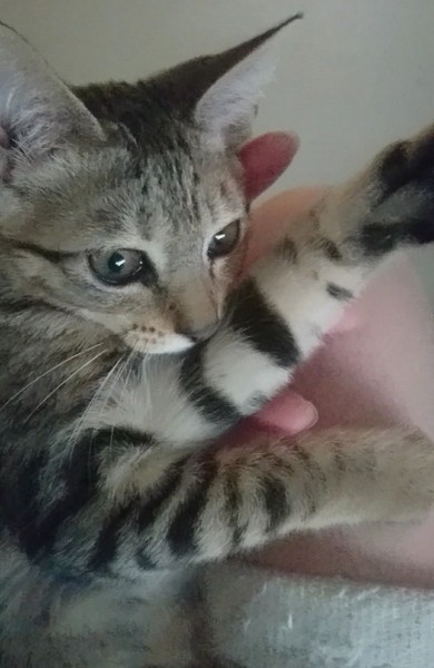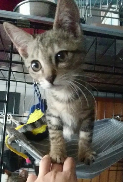 | 特徴(性格など) | 快食・快便で元気です! ・エイズ・白血病検査済:陰性 ・ワクチン接種済み (初回&追加接種済) ・体内外寄生虫駆除薬済み 明るく活発で天真爛漫さが可愛い女の子です。先輩猫にも物おじせず、積極的に遊びのアプローチします。人とのおもちゃ遊びも大好き☆元気いっぱい遊んだあとは、人のそばで急におネンネモードに!コテンと眠ってしまう姿もとても可愛いです。 保護以来、トイレの失敗無し◎ ケージでのお留守番も良い子に過ごせます。 |