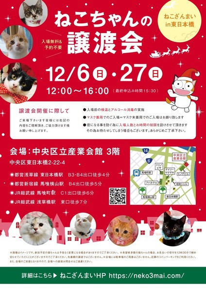 | その他(譲渡条件など) | 【新型コロナウィルス感染予防対策について】 譲渡会開催に際し、ご来場下さいます皆様には以下の内容をご理解頂き、ご協力頂けます様お願い申し上げます。 ●入場前の検温とアルコール消毒の実施 ●マスク着用でのご入場=マスク未着用でのご入場はお断り致します ●入場人数の制限=一度に入場できるのは50名迄とさせていただきます ●時間と人数の制限=密になる事を防ぐ為に入場人数とお時間の制限を設けさせて頂きます その為お待たせしてしまう場合もございます ●会場利用規約により、ご来場者様の連絡先を控えさせていただきます あらかじめご了承下さい 里親様決定は14時以降となります。 その後、迎え入れ準備の説明等のお時間も頂戴しますので、お時間に余裕を持ってご来場下さい。 諸々の制限がございますが、安心・安全な譲渡会運営のためにご理解・ご協力いただきますようお願い申し上げます。 ~~~~~~~~~~~~~~~~~~~~~~~~~~~~~~ ★仔猫ご希望の里親様★ 仔猫ちゃんたちは、まだ体がしっかりしていない赤ちゃんです。 下痢だけでも数時間対応ができなかっただけ死に至る事もあります。 その為、月齢に応じたお留守番時間を設けさせていただいております。 また、子猫ちゃん(6ヶ月未満)の里親様には子猫支援金のご協力をお願い致しております。 ★猫ちゃんとのお見合いは譲渡会で!★ ねこざんまいの猫ちゃんは譲渡会でのお見合いのみとなります。 『この子はいつ譲渡会に参加するの?』『譲渡会場の場所はどこ?』など はねこざんまいホームページをご覧ください。 https://neko3mai.com/ ★楽しく猫ちゃんと触れ合って★ ねこざんまい譲渡会は、猫ちゃんも里親様も保護主も笑顔で過ごせる譲渡会を目指しています。 これから20年以上、楽しい時も、悲しい時もいつも傍にいてくれる大切な家族になる猫ちゃんです。 会場には沢山の猫ちゃんがいます。 1匹1匹、触れ合って猫ちゃんとお話ししてください。 『初めて猫ちゃんを家族に迎える方』 『先住猫ちゃんのお友達を迎える方』など トライアルの仕方や先住猫ちゃんと仲良くなるコツなど経験豊富な保護主やスタッフにお気軽にご相談ください! 猫を愛し、そして猫に愛されている猫好きスタッフと保護主がアドバイスさせていただきます。 ★里親希望のみなさまへ★ ペットではなく、家族一員としてたっぷり愛情を注いでくださるご家庭をお待ちしております。 恐れ入りますが、 ・学生の方 ・一人暮らし、同棲中の方 ・子猫、若猫希望の60歳以上のみのご家庭 ・脱走防止対策にご協力いただけない方 は原則譲渡を遠慮させていただいております。 ただし、預かりボランティアさんとして新しい家族が決まるまでの間、猫ちゃんを預かっていただく道もございます。 参加猫ちゃんは、それぞれ保護主(実際に猫ちゃんを自宅に入れ、保護をしている方)が異なります。 詳しい条件なども異なる場合がございますので、会場内で直接保護主とお話ください。 〖共通条件〗 1.終生飼育 2.完全室内飼い 3.脱走防止対策へのご協力 4.避妊去勢手術 5.契約書類へのサイン 6.定期報告 7.医療費等の負担 当日の猫ちゃんを連れて帰ることはできません。後日、保護主が里親様のご自宅までお届け致します。 その為、移動の際の猫ちゃんの負担を月齢などから考慮し、お届け地区を限定させて頂くこともございますのでご了承ください。 ご理解とご協力のほど宜しくお願い致します。 ☆よくある質問☆ ・譲渡の条件 ・ご負担頂く費用 ・譲渡会の場所等は ホームページに詳しく掲載させて頂いておりますのでご覧ください。 https://neko3mai.com/ メールでのお問い合わせはすぐにご返答出来ない場合がございますのでご了承ください。 ホームページ https://neko3mai.com/ お問い合わせ http://www.neko3mai.com/contact/form_general.html ねこざんまいブログ http://ameblo.jp/neko3mai/ |