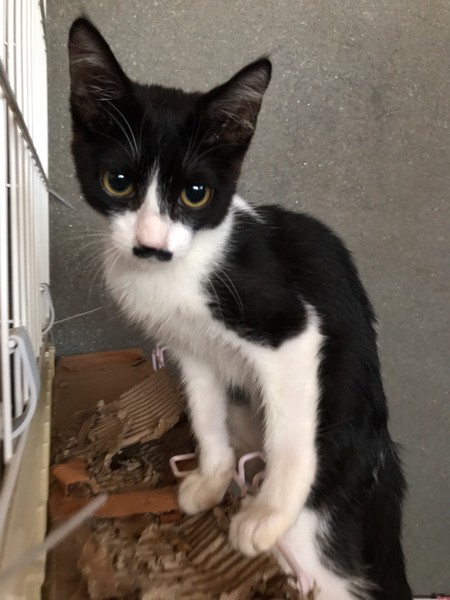 | 特徴(性格など) | チャップリンや野口英世の様なお髭がチャームポイントのハチワレくん、生後4ヶ月程のエスくんです。 写真を向けられるとクッと顔に力が入りちょっとクールな顔をしてしまいますが、生エス君はまだまだ子猫らしいお顔をした可愛い男の子です。 慣れない環境には怖がりますが、慣れるとさすが子猫!大いに走り回り遊び回り跳び回ります(笑) 初めましての人に抱かれるとドキドキしますが、ついつい懐っこい性格が隠せず体は固まってもノドが勝手にゴロゴロ〜ゴロゴロ〜っと鳴ってしまいます(笑)猫掴みされてもゴロゴロいってるくらいです。かなり甘えんぼ君になる傾向あり!なご様子です(^^) |