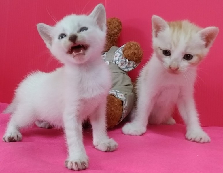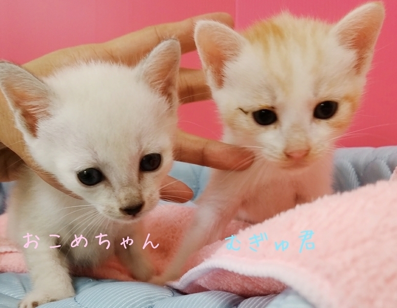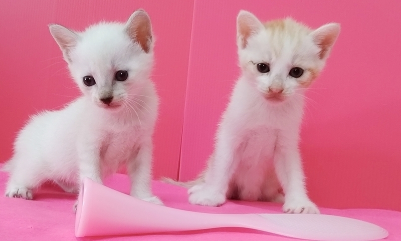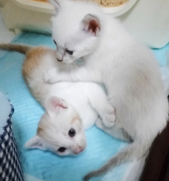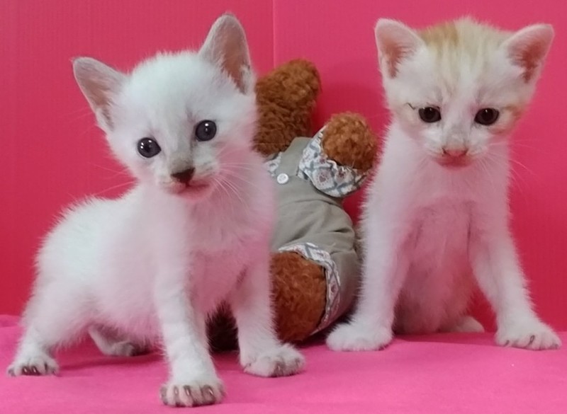 | 特徴(性格など) | 白(おこめ仮名)女の子 全体的に奇麗な白で 鼻と耳のふち尻尾が黒くシャムっぽい白猫で 食欲旺盛の女の子。 ♡茶白(むぎゅ君仮名)男の子 薄茶色の模様があり優しい女の子のような可愛さです。 |