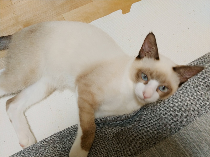 | 特徴(性格など) | ラグドールの毛が短い感じの雑種です。 とても、おっとりとして落ち着きのある子です。 人馴れもしており、抱くとゴロゴロ言ってます。 |