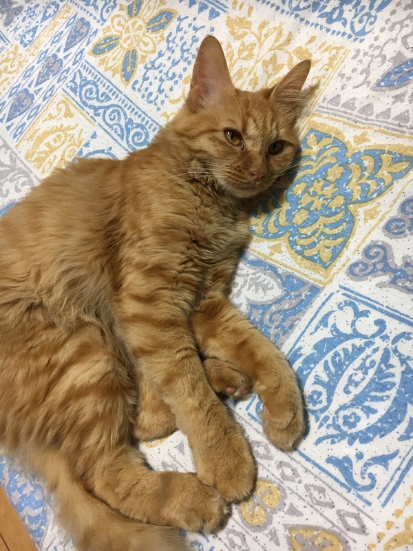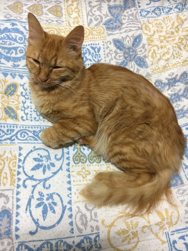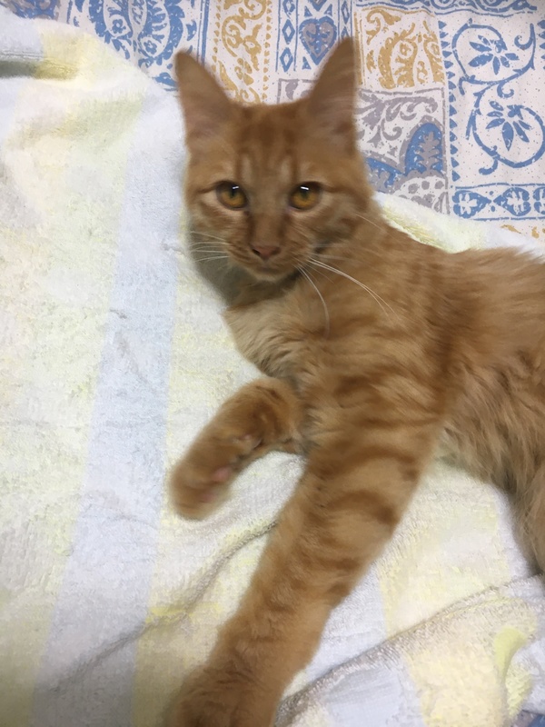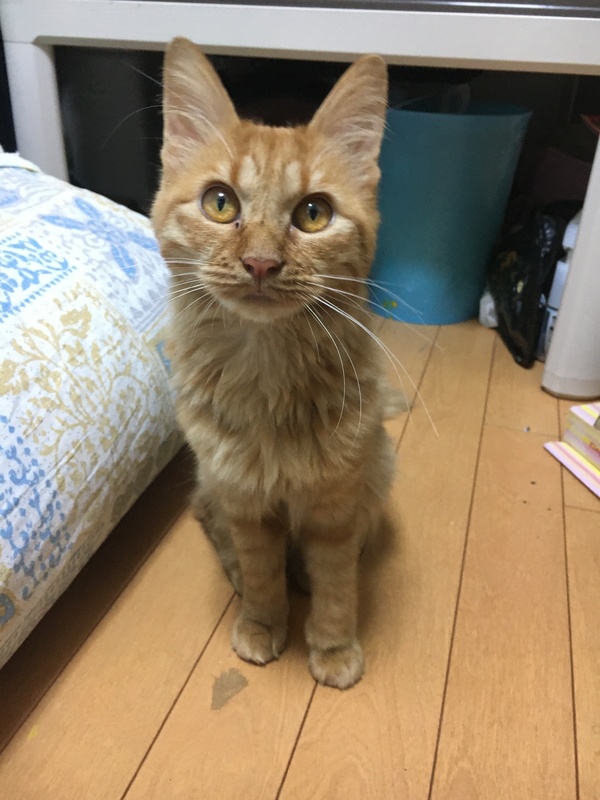 | 特徴(性格など) | 茶トラと毛長猫のミックスの様で、顔まわりや、前後の足にはシマシマ模様があり、体やしっぽの毛は長目です。少し怖がりですが、甘えん坊ですよく鳴きます。ネズミのおもちゃが大好きで、ジャンプしたり、活発な女の子です。 | ||