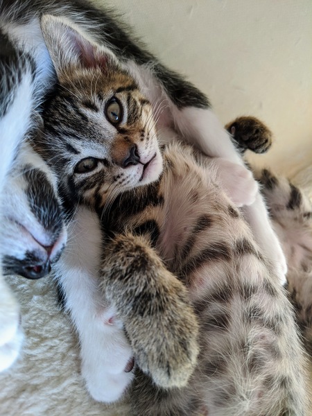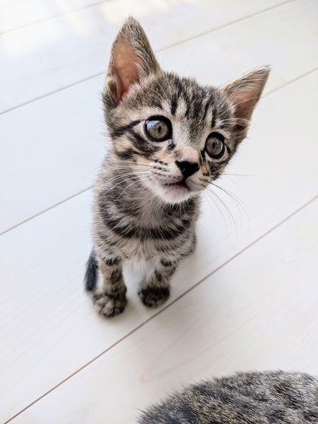 | 特徴(性格など) | 2020.7.7生まれ(推定) 毛色:キジトラ シュっとした顔立ちのキジトラ ジジ君。 スレンダーなボディでパワフルに走り回る、とっても子猫らしい男の子!! さっきまで遊びまわっていたのに、気づくと近づいてきて「みゃーみゃー(なでろ~~!!」と訴えてくる甘えん坊さん♪ へそ天で見つめてくる姿が可愛すぎ♡ 遊んでいる時と甘えてくる時のギャップがまたらないツンデレ系ン男子に癒されること間違いなしです☆ |
