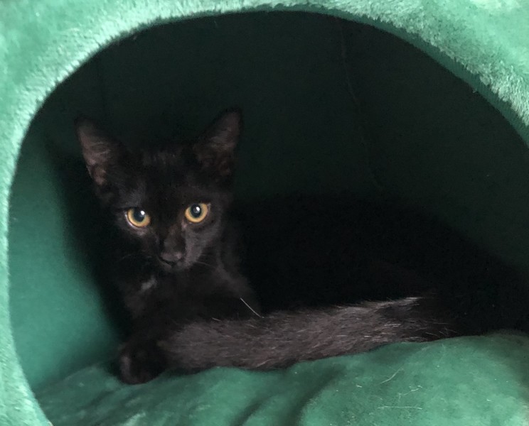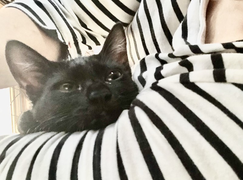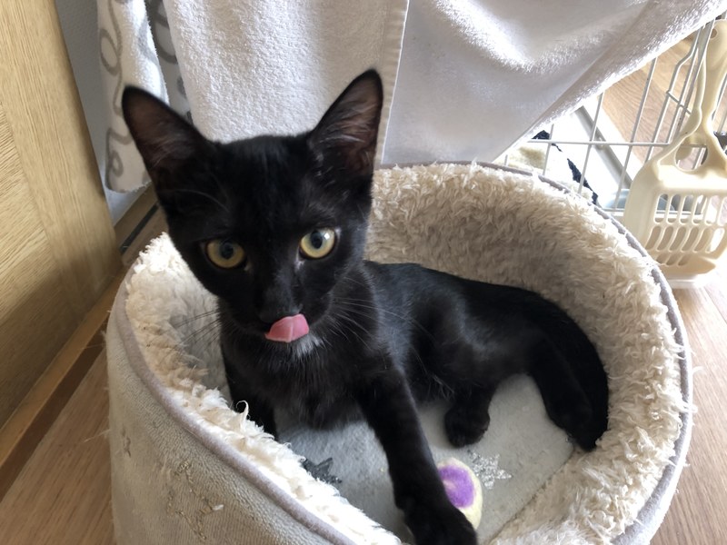 | 特徴(性格など) | イケメンの黒猫男子です! 最初だけ少し人見知りしますが、慣れたら元気いっぱい遊び、とても甘えん坊です。 おひざに乗ってゴロゴロ言います。 おもちゃとちゅーるが大好き。 きょうだいの「ローズマリー」と仲良しです。 |