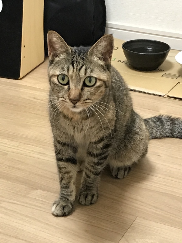 | 里親募集する理由 | 自転車で移動中、鉛筆みたいに痩せている猫と目が合ってしまい、いたたまれずに餌付けをして保護しました。我が家は2頭までしか飼育を認められない住宅で、すでに先住猫が2匹いるため、この子を飼う事ができません。今は1匹だけで5畳程の部屋で過ごして貰っています。 | ||