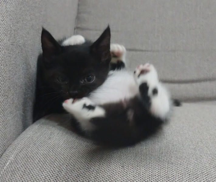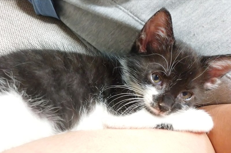 | 特徴(性格など) | お鼻まで黒い黒白柄です。背中とシッポは黒でお腹と足は白になっています。 兄弟で保護しましたので毎日一緒に走り回って遊んでいますが、少し小柄であまりケンカは強くないようで目を閉じながら応戦していてかわいらしいなぁと思います。 よく鳴きながらヒトのところに寄ってきて甘えます。 |