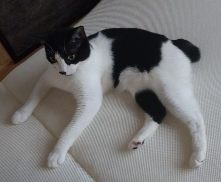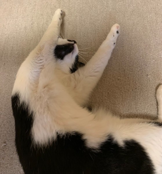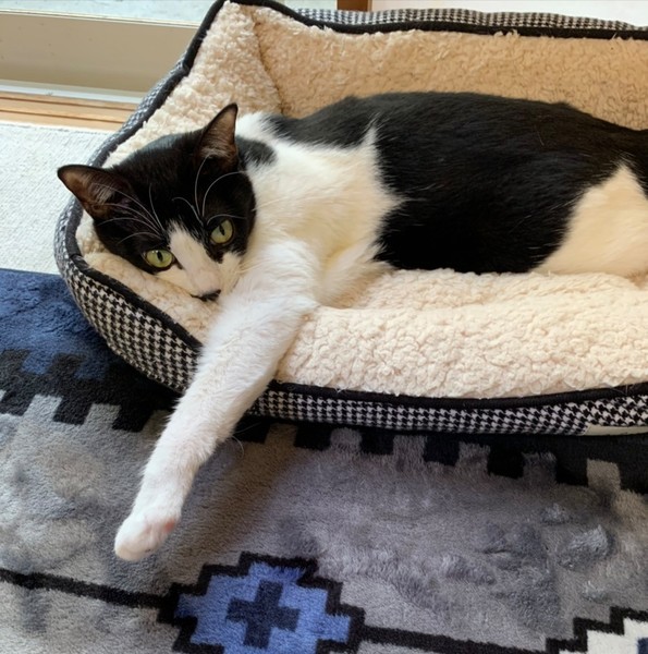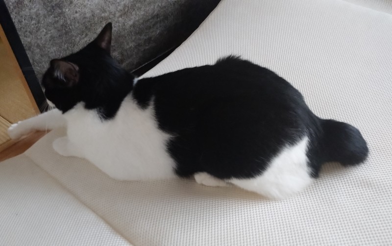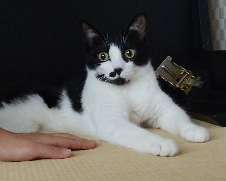 | 特徴(性格など) | 2歳の黒白ハチワレ柄のメス猫です。 チョビヒゲとアゴも黒くて個性的でかわいらしいです。 色が黒い部分はとても黒く白い部分はとても白くハッキリしてとてもキレイだなと思います。 足が短いわけではないのですが、なんとなくモコっとしています。 そして短くてひらたいなんともいえないキュートなシッポが魅力的です! 性格はツンデレ女子です。 時々猫パンチもでますが、慣れてくると淋しがりやで甘えん坊です。 若いためオモチャで遊ぶのも好きです! |