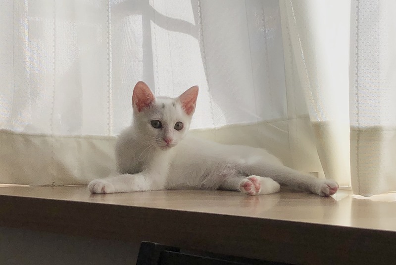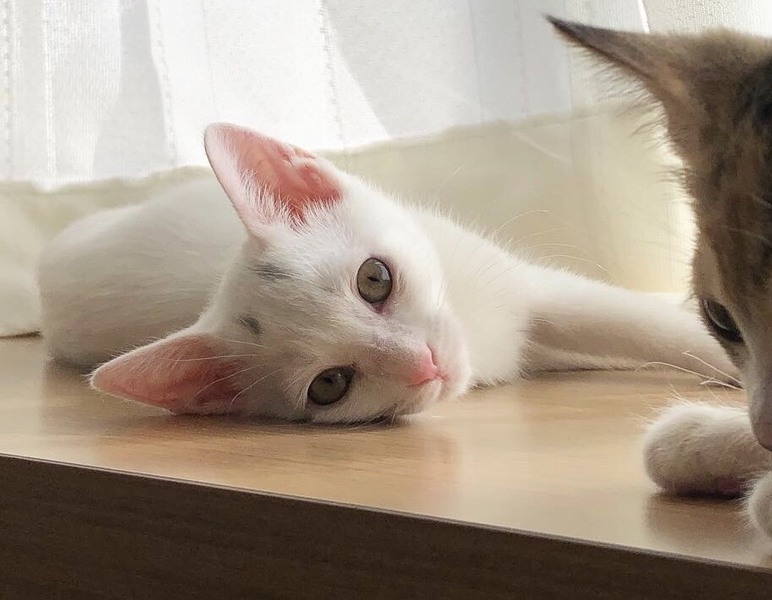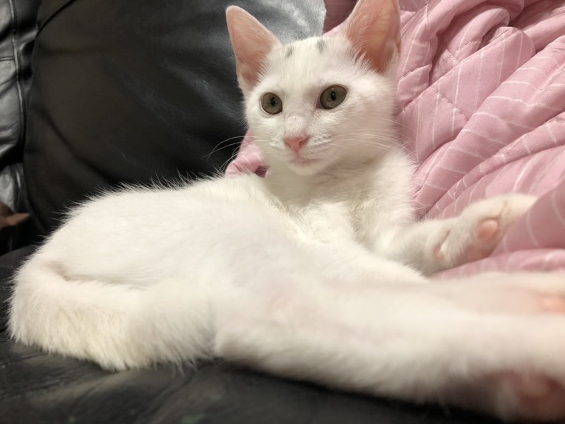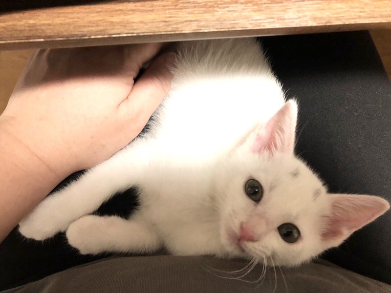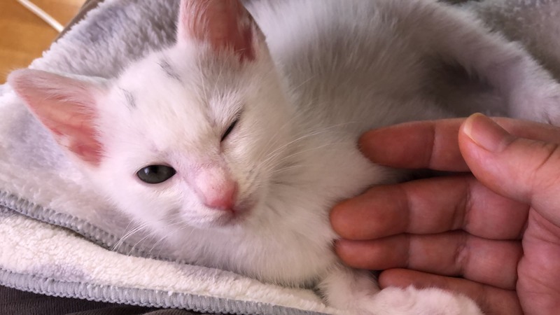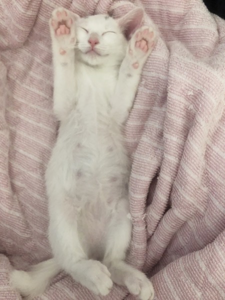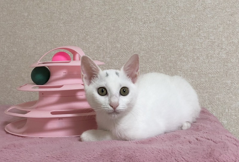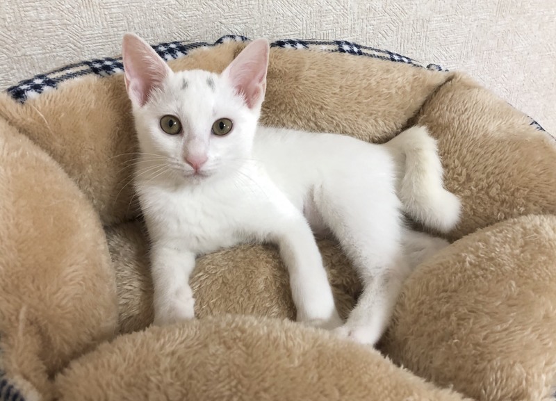 | 特徴(性格など) | 2020.6.18生まれ(推定) 毛色:白 真っ白ボディに麻呂眉のようなキトンキャップがカワイイ女の子♀ 預かり宅で一緒に過ごしているクレパスととっても仲良しです♪ ご飯よりも遊ぶの大好きなので小柄ですが、パワーは他の子達に負けません! 抱っこや肩乗りが大好き★ いつも誰かに寄り添って眠る甘えんぼさんです♡ |
