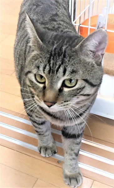 | 特徴(性格など) | ●色 柄= キジトラ ●体 格= 見ての通り、首 足 胴ガッシリとした筋肉体質のキン肉ニャン。身体も健康で、運動能力もなかなかです。(美味しいもの目指してどこでもジャンプ!) ●性 格= ちょっとだけシャイ。 今のところ誰にでもOKではないけど、そこは里親さまの優しさと努力?で、べた猫になる予感。 遊ぶの大好きな活発さが可愛い。 |