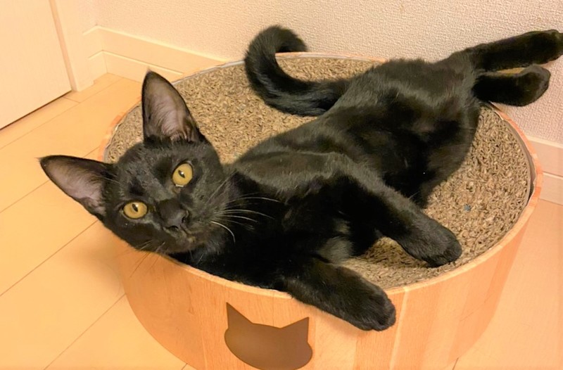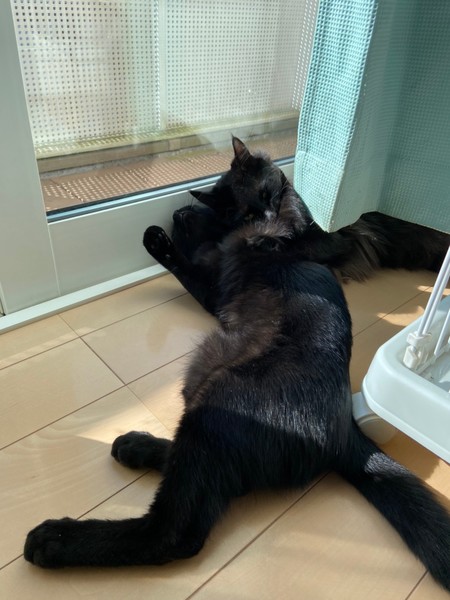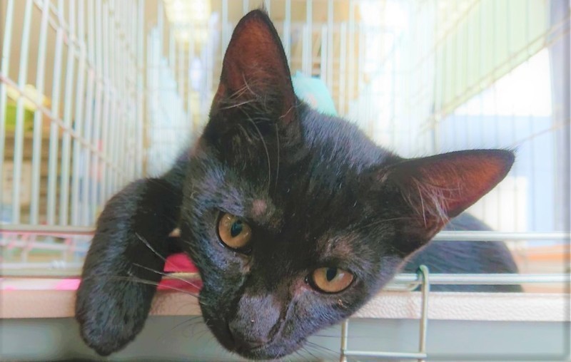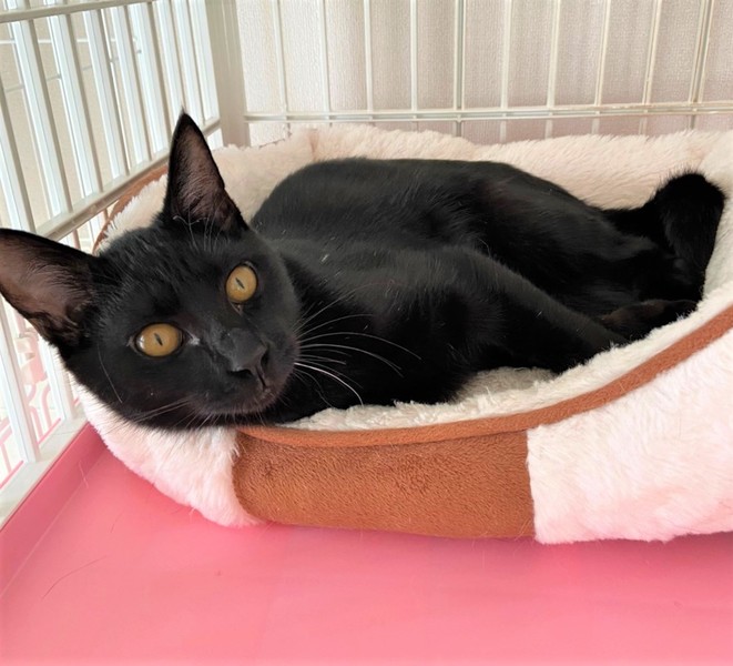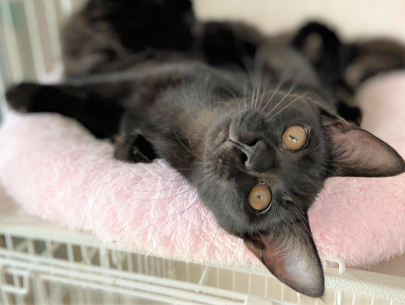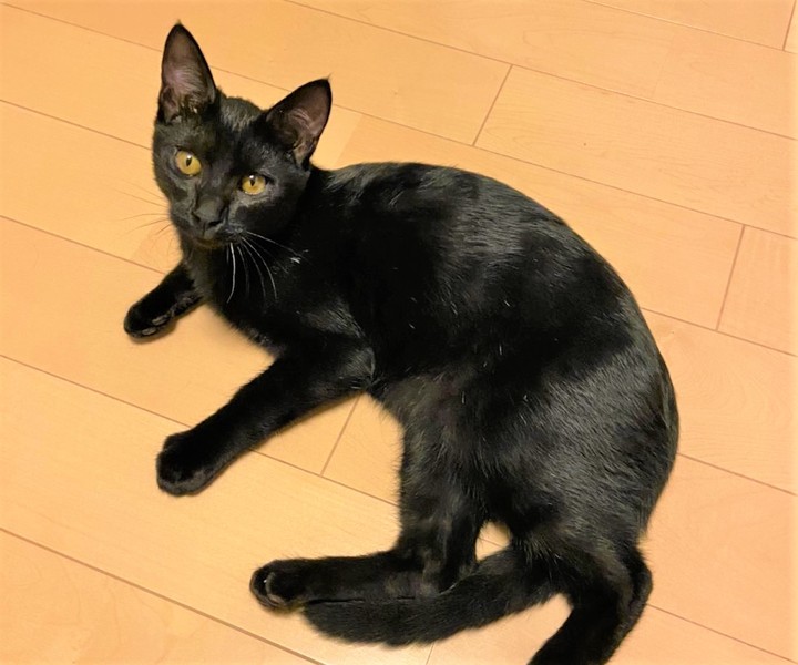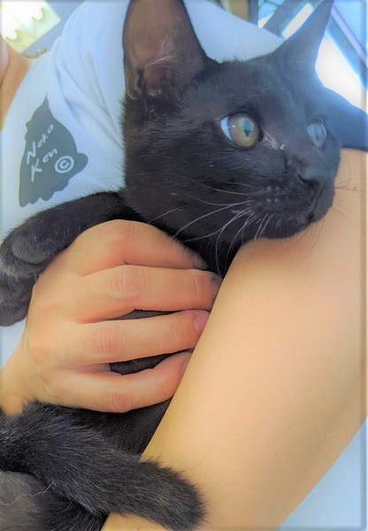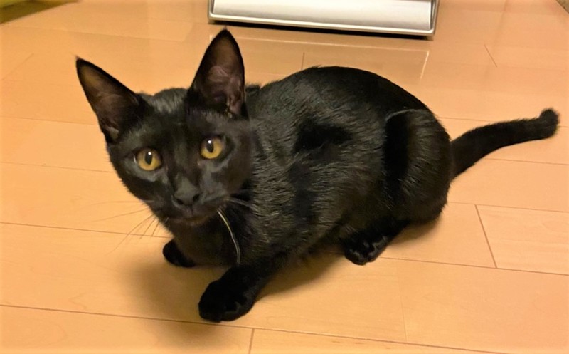 | 特徴(性格など) | 2020.6.1生まれ(推定) 毛色:黒 全身真っ黒。 艶のある毛並みはビロードのよう。 長い尾尻にスリムなボディー。 性格はとても甘えん坊。 ケージから飛び出ると一目散に膝の上に♡ 抱っこが大好きでずっと喉を鳴らしています。 |