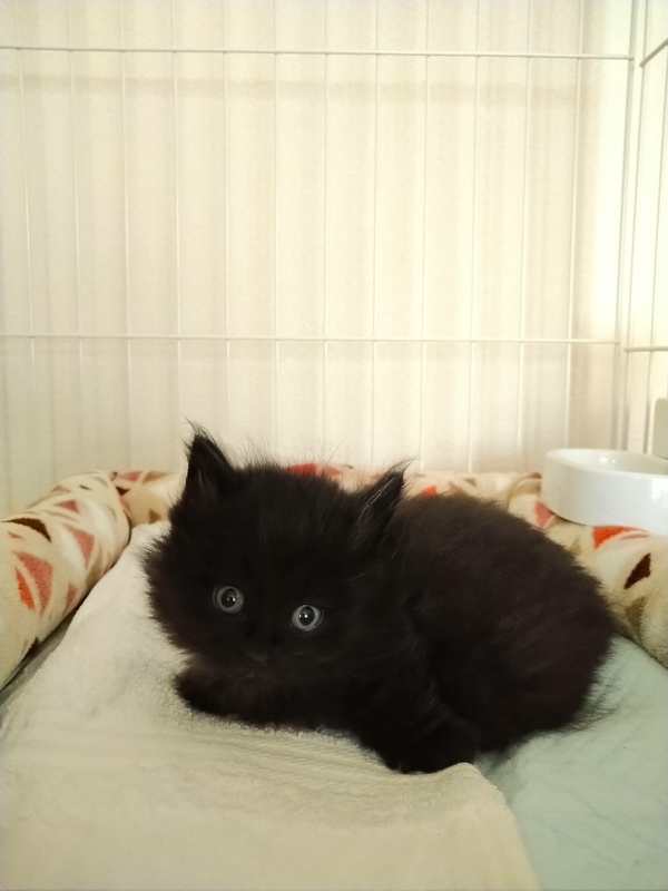 | 特徴(性格など) | 生後1〜2ヶ月位の元気な長毛の黒猫赤ちゃんです。 威嚇や噛み付き引っ掻き等はありません、構ってあげると喉ゴロゴロ鳴らして甘えてきます。 離乳出来ているのか、カリカリ、ウェットフード食べます! トイレはおしっこのみ確認、トイレでちゃんとしてます。 |