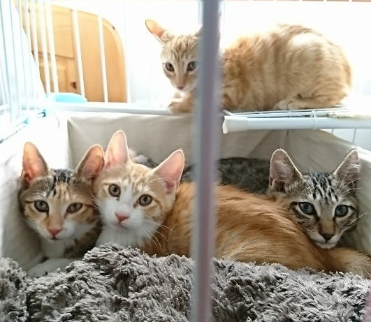 | 特徴(性格など) | 茶白の女の子。 兄妹猫のうちの1匹です。 兄妹とても仲が良く、一緒に遊んで寝て元気いっぱいです。 人見知りはするので最初はシャーッと言ってしまうこともありますが、慣れるととってもかわいいです♪ 慣れるまで時間がかかる場合でも長い目で見て接してくださる優しい里親さん、探しています。 1匹での譲渡ももちろん可能ですが、兄妹一緒に引き取ってくださるかた、大歓迎です。 ※健康状態良好です ・ワクチン接種済み(1回目) ・血液検査済み(エイズ、白血病検査→陰性) ※生年月日について このサイトのシステム上の関係で7/1としていますが、実際のはっきりとした生年月日は不明です |