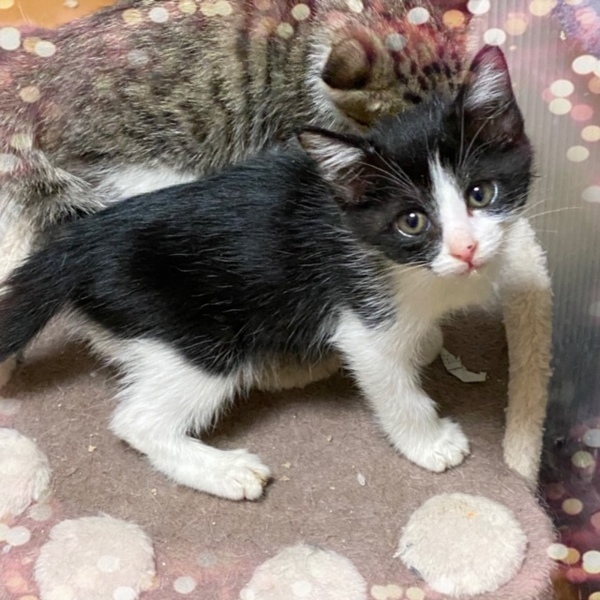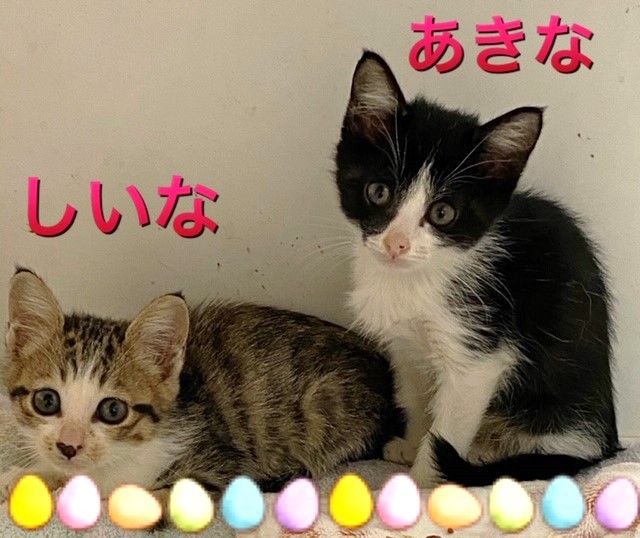 | 特徴(性格など) | しいな ♀ キジ白 シャイですが、触ったり抱っこしたり出来ます。ビビりですが、お触り修行をして慣らしています。 あきな ♀ 黒白 とっても人懐こく性格花丸です。 |