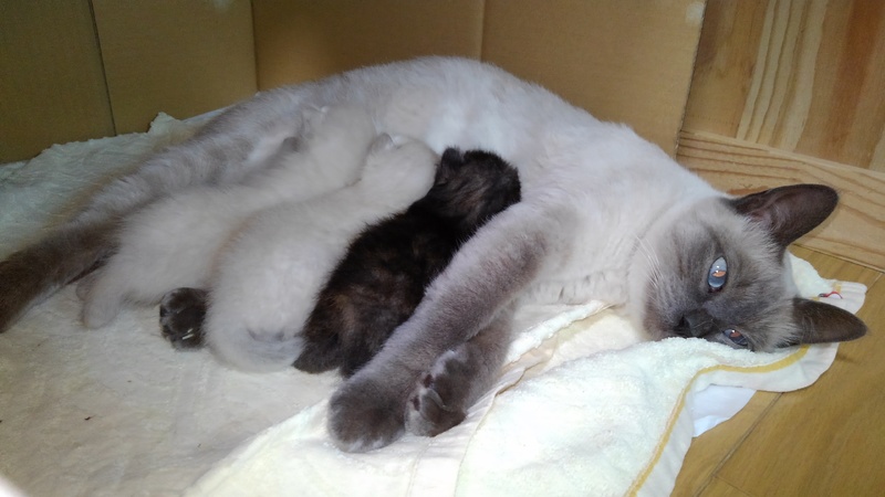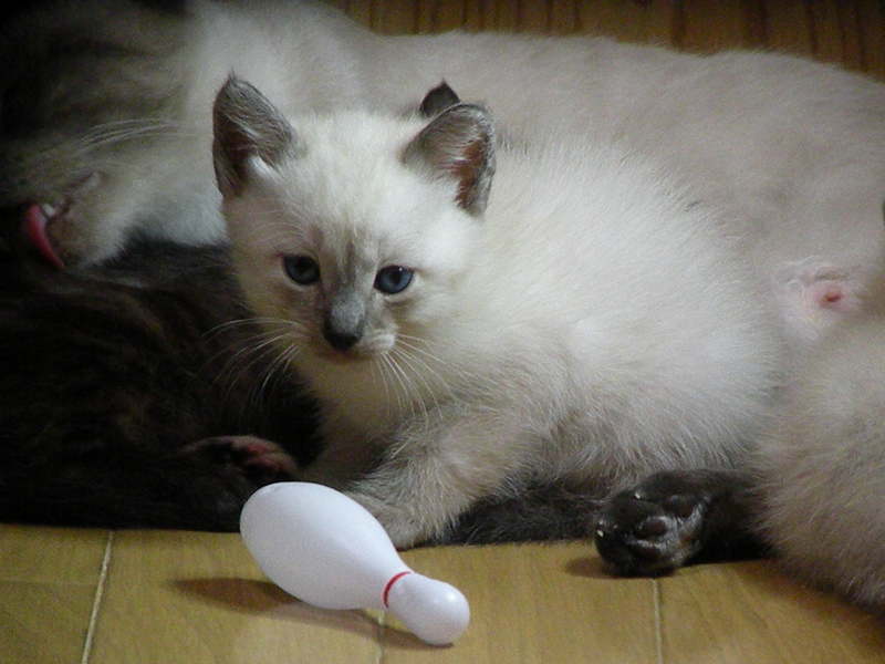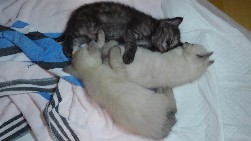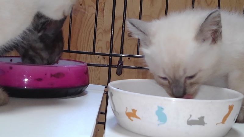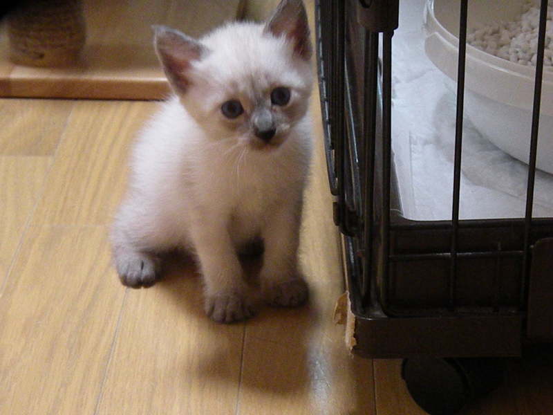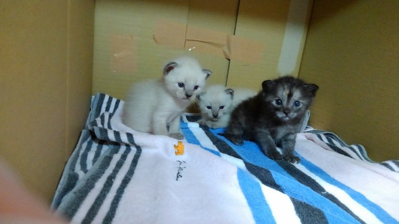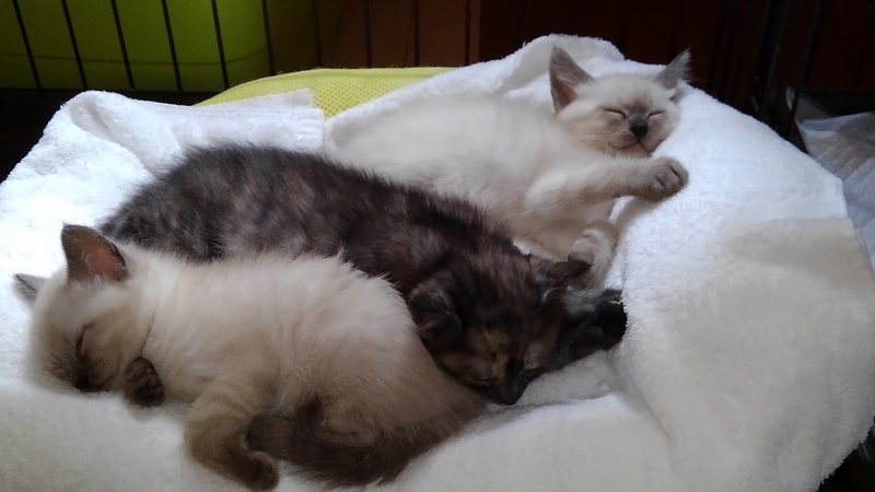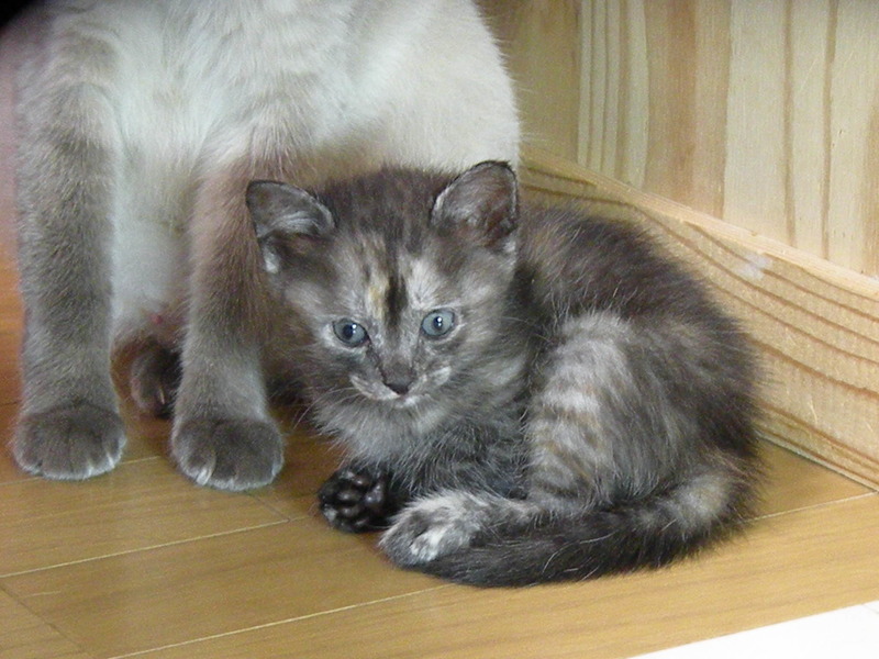 | 特徴(性格など) | さび柄は女の子(の筈)。シャムっぽい柄の2頭の子たちは雌雄不明。、遊んではおっぱい飲んで、寝ては離乳食食べて、人見知りも猫見知りもしない天真爛漫な、見ていると切なくなる程の可愛盛りです。 | ||