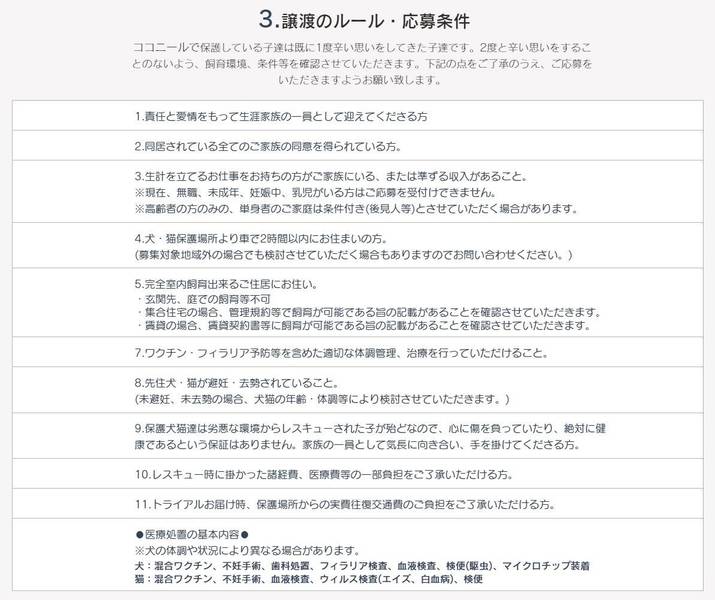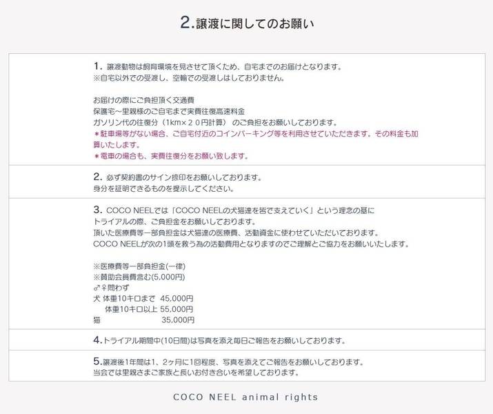 | 譲渡費用(医療費、交通費など) | 医療費負担金 30,000円(去勢手術、ワクチン代他含む) 賛助会員費 5,000円 預かり宅からお届け先までの実費往復交通費をいただきます 詳細はHPでご確認ください。 |