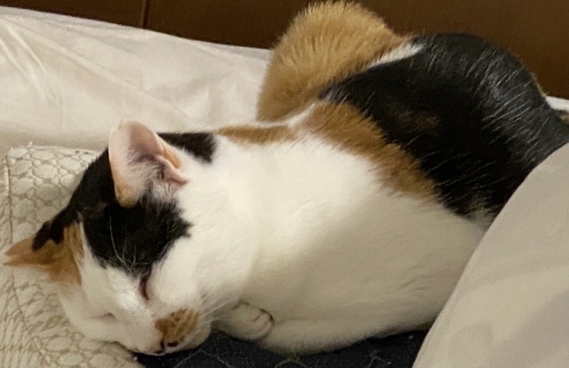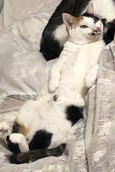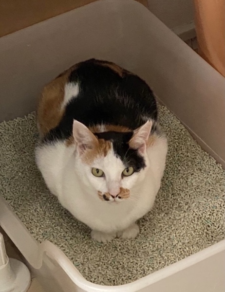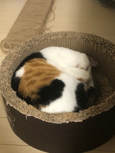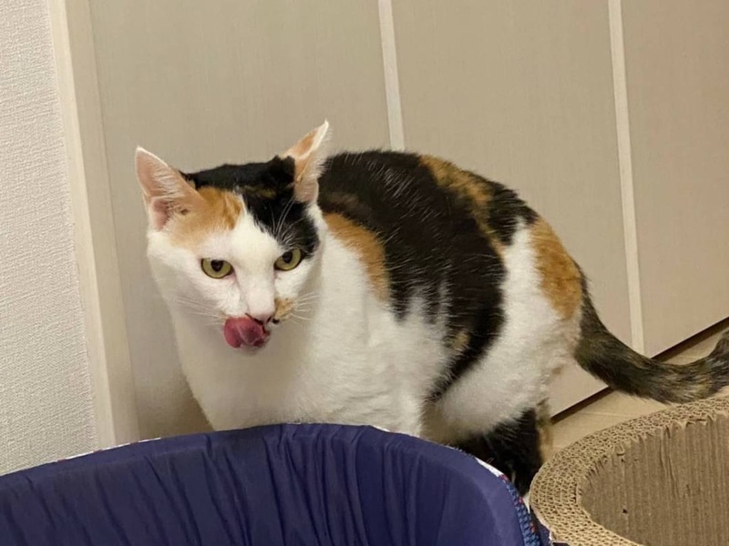 | 特徴(性格など) | とても綺麗ではっきりした三毛模様を持つ女の子です。頭の六四分けのように見える部分がちょうどオレンジと黒に別れているなど、ユニークな模様をしています。特に口元にはちょびひげ風の可愛い黒い模様があります! 以前まで地域猫として暮らしていたため、現在も人馴れ訓練継続中で、オヤツなどでコミュニケーションを取って、少しずつ距離を縮めているところです。診察中は洗濯ネットの中で大人しく待つことができ、その状態だと抱っこも出来ます。よく獣医さんから我慢強く、生命力の強い子だねと褒められます。 ツンデレで、人は苦手ですが、猫のことは大好きな、とても猫らしい性格をしています。毛繕いに夢中になっている際は、こっそりと後ろから撫でることができたり、人と気づかずにスリスリしてくる事もあります。最近はコタツの虜になっており、他の猫と一緒にほかほかとまったり過ごしています。 ちゅーるやかつおぶしなどの魚介系おやつが大好きです。 普段はドライフードを中心に与えていますが、食欲旺盛で、何でもよく食べてくれます。最近は煮干しにハマっているらしく、他の猫の餌皿から器用に手を使って取り出して、盗み食いをします。 食べ物への熱意が強く、人がキッチンに立つと颯爽と現れては、真後ろから圧をかけてきます。 |