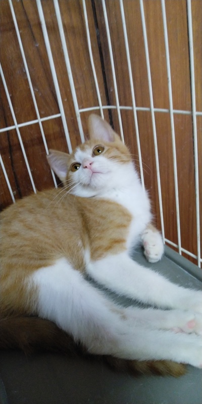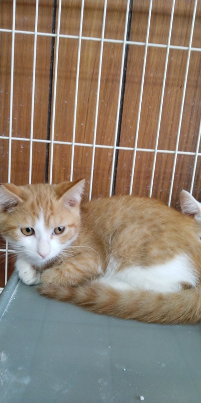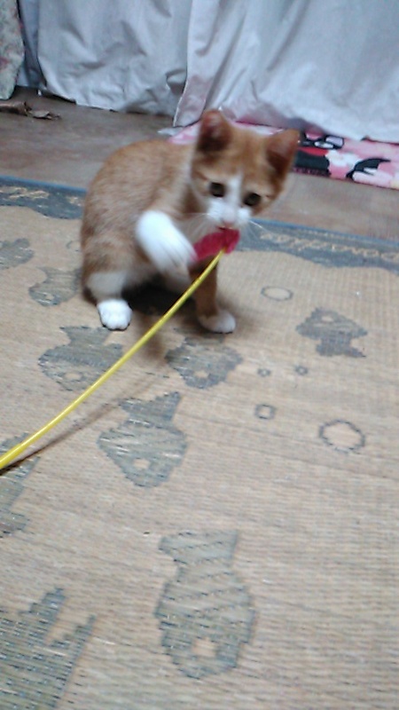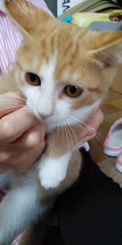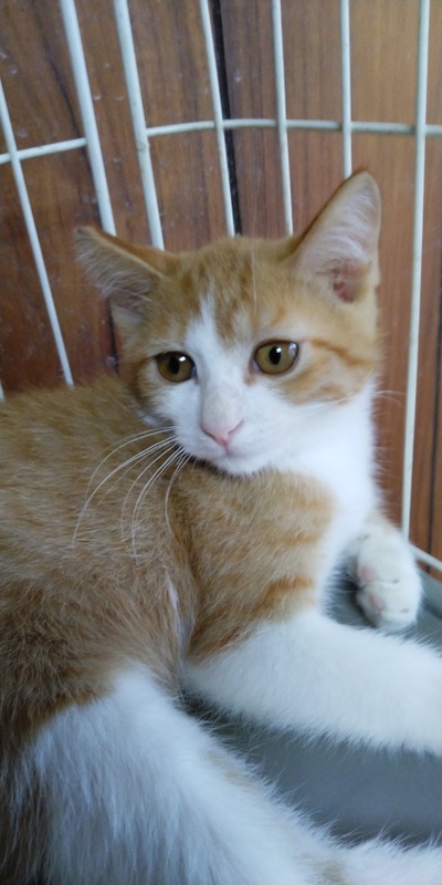 | 特徴(性格など) | 茶白の可愛い子猫です。茶色は薄めです。おとなしく、撫でると喉をゴロゴロならします。オモチャで遊ぶのも大好きです。飼いやすいと思います。 カリカリやパウチを食べています。 |