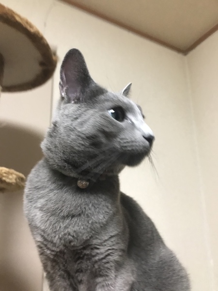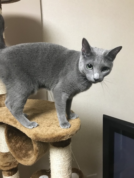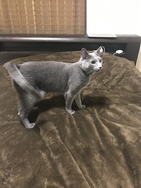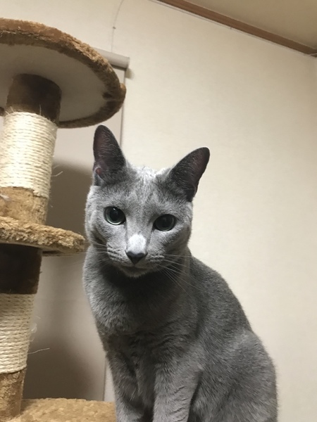 | 特徴(性格など) | ロシアンブルーならではの毛がグレーで目も綺麗なブルー色です。 色々な物に興味津々で少しヤンチャな女の子です。 ご飯もしっかり食べます。 よくオモチャで遊びますが、「オモチャは?」というとオモチャを近くまで持って来てくれます。笑 頭のいい子です。 |