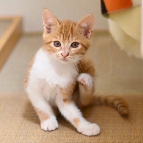 | 特徴(性格など) | 4兄弟の紅一点。最初は少し怖がって兄弟の後ろに隠れていましたが、馴れてきたら本領発揮。今ではお兄ちゃんたちに混じってプロレスごっこしちゃうお転婆さんになりました。 兄弟で繰り広げられる保護主のお膝争奪戦では、膝では勝てない!と、背中から登る技を覚えました(笑)さすがメス猫さんです。 おさむくん、ひとしくん、まもるくんと兄弟です。兄弟2匹でのお迎えも嬉しいです。脱走対策をしっかりとして下さるお家を希望します。 |