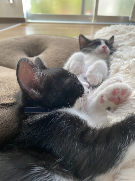 | 特徴(性格など) | 黒白ハチワレ。 生後2ヶ月弱くらいかと思います。 人慣れしていてとても可愛いです。 体重は630g〜690gでした。(10/5) ノミ・マダニ取りのサンスポット滴下済み。 餌の食い付き良いです。 9/30診察済み、糞便検査異常なしでしたが少々便が緩い子がいるので一応お薬もらっています。餌の影響もあるとのことで徐々にドライフードに切り替えています。 |