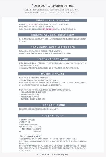 | その他(譲渡条件など) | 預かり宅より2時間以内をお届け目安とさせていただきます ✱応募方法✱ 里親希望の方は、以下のURL又は画像に記載の『譲渡のまでの流れ』『譲渡のルール・応募条件』『譲渡に関してのお願い』のご確認のうえ、『里親希望エントリーフォーム』よりご応募お願い致します。 ※お返事には1週間程度のお時間が掛かる場合があります。 『譲渡のまで流れ』 https://coconeel.wixsite.com/website/bosyunonagare 『譲渡に関してのお願い』 https://coconeel.wixsite.com/website/blank-4 『譲渡のルール・応募条件』 https://coconeel.wixsite.com/website/blank 『里親希望エントリーフフォーム』 https://coconeel.wixsite.com/website/entry ※ご質問等ある場合は、フォームの最後の欄にお書き添えください。 ※先着順ではありません。 犬の性格・年齢・病気等を考慮し、多方面から検討させていただきます。 |