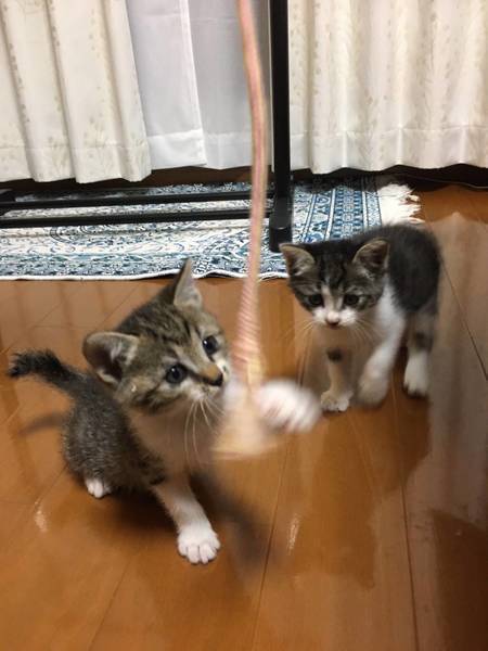 | 特徴(性格など) | サバトラ2匹です。 おでこのM柄がはっきりしている方がメスで独立心旺盛。 鼻筋が白い方がオスで甘えん坊です。 |