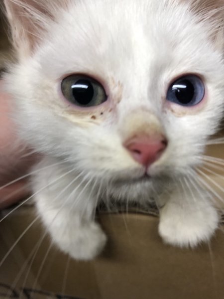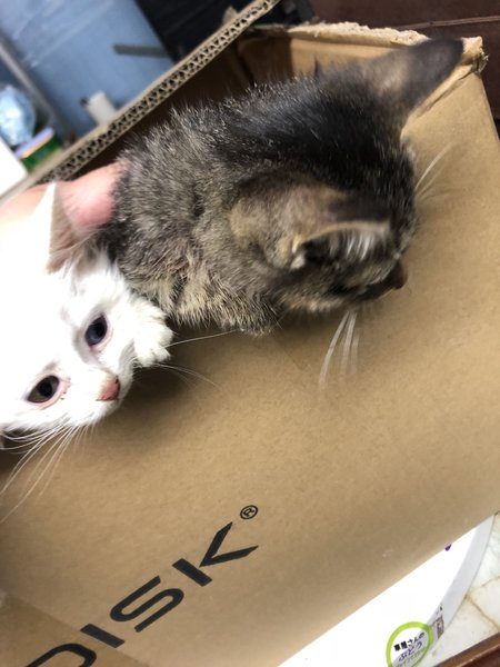 | 特徴(性格など) | 白猫ちゃん 頭のてっぺんに黒い模様があります。 ブルーとグレーのオッドアイがキュートです! キジトラちゃん クールな眼差しだけど好奇心旺盛元気いっぱいです! 元気があり過ぎて上手く写真が撮れませんでした… おそらく二匹共にオスで兄弟ではないかと思います。 病院には行けておりませんので、お渡し後に病院に連れて行って検査してあげてください。 |
