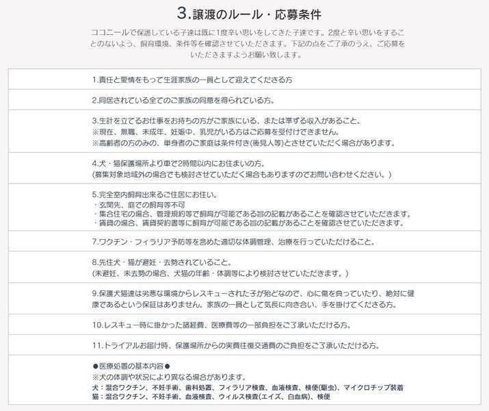 | その他(譲渡条件など) | 預かり宅より1時間以内をお届け目安とさせていただきます ✱応募方法✱ ※いつでも里親募集中からのご応募は受け付けられません。 里親希望の方は、以下のURL又は画像に記載の『譲渡のまでの流れ』『譲渡のルール・応募条件』『譲渡に関してのお願い』のご確認のうえ、『里親希望エントリーフォーム』よりご応募お願い致します。 ※お返事には1週間程度のお時間が掛かる場合があります。 『譲渡のまで流れ』 https://coconeel.wixsite.com/website/bosyunonagare 『譲渡に関してのお願い』 https://coconeel.wixsite.com/website/blank-4 『譲渡のルール・応募条件』 https://coconeel.wixsite.com/website/blank 『里親希望エントリーフフォーム』 https://form.run/@coconeel ※ご質問等ある場合は、フォームの最後の欄にお書き添えください。 ※先着順ではありません。 犬の性格・年齢・病気等を考慮し、多方面から検討させていただきます。 |